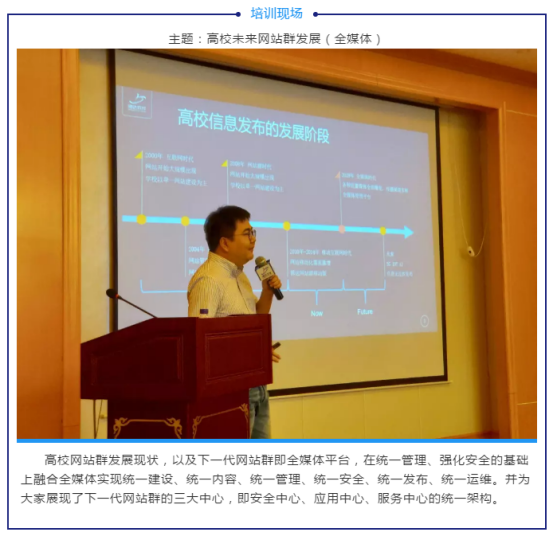 此次培训班开班仪式由博达软件副总经理王总表达对老师们一如既往支持的感谢。王总提到,博达软件于今年正式推出全新的全媒体产品,并在很多高校进行应用实践。博达软件定位为大型组织内容管理与智能服务提供商,博达的发展离不开各高校老师的长期支持,建设下一代网站群是博达的目标,为高校提供更安全、更智慧、更高效的服务是博达持续发展的动力。