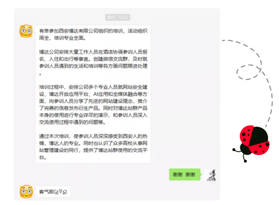 在后续的工作中,博达软件将继续提高服务能力和服务水平,持续为高校网站群建设、运营的发展创新赋能,将博达培训班的项目长期进行下去,力求在促进高校网站群建设发展道路上开阔一片天地。